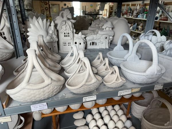 There you'll find a wide selection of greenware to choose from and at very affordable prices. They do carry some bisque, but at double the price. They have pumpkins, dishes, trees, ornaments, bunnies, Indian folk-art, glazes, supplies and a whole lot more. Keep the box they give you, so you can take your finished piece home safely after class.